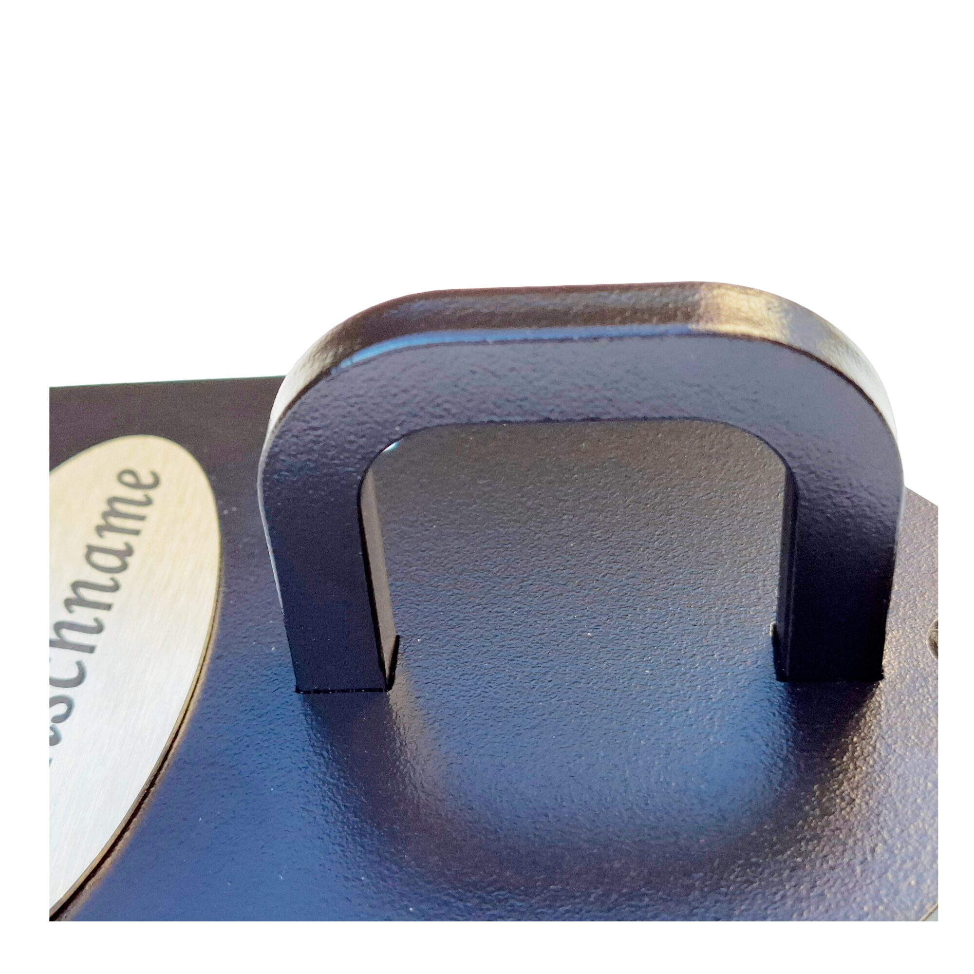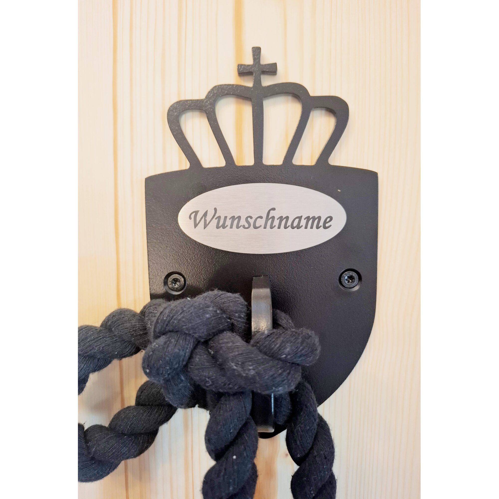 Der verwendete Farbton RAL 8022 (Schwarzbraun) wirkt je nach Beleuchtung schwarz, erzeugt jedoch durch den Braunanteil eine sehr exklusive Optik. Die Edelstahlplakette wird mit Ihrem Wunschnamen graviert und macht den Trensenhalter zu einem individuellen Unikat.