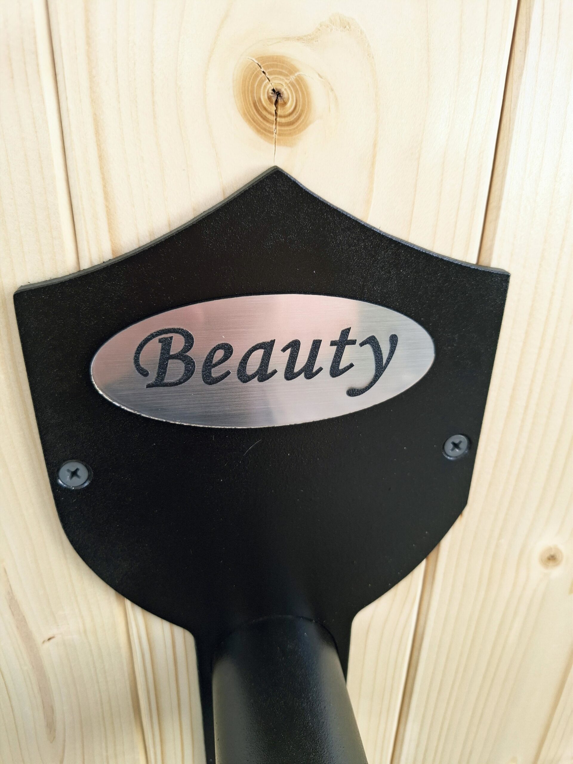 Der verwendete Farbton RAL 8022 (Schwarzbraun) wirkt je nach Beleuchtung schwarz, erzeugt jedoch durch den Braunanteil eine sehr exklusive Optik. Die Edelstahlplakette wird mit Ihrem Wunschnamen graviert und macht den Sattelhalter zu einem individuellen Unikat.