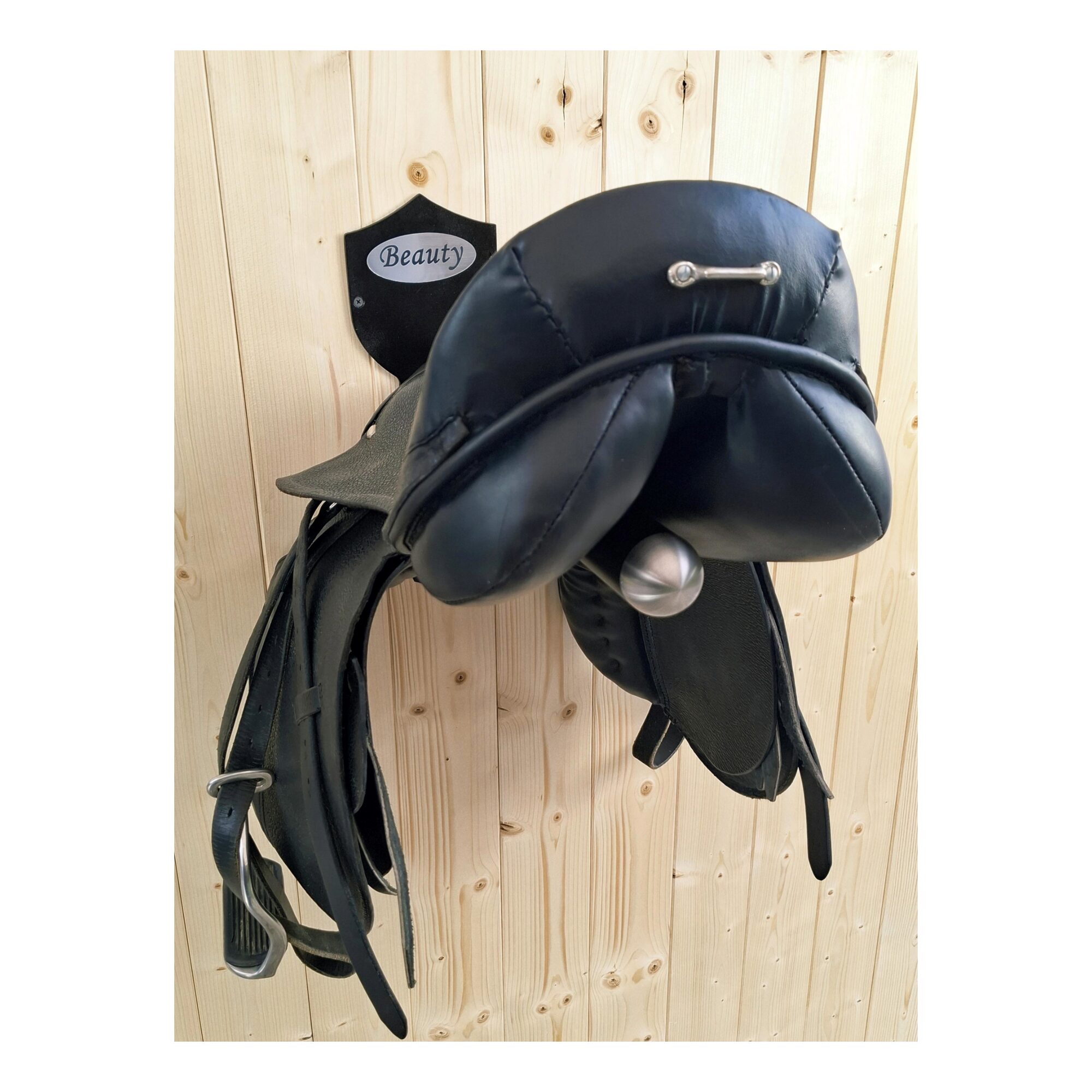Der Sattelhalter „Gutshof“ mit Namensgravur verbindet maximale Funktionalität mit hochwertiger Verarbeitung. Der stabile Träger hält Ihren Sattel sicher und schont diesen durch seinen runden Querschnitt.