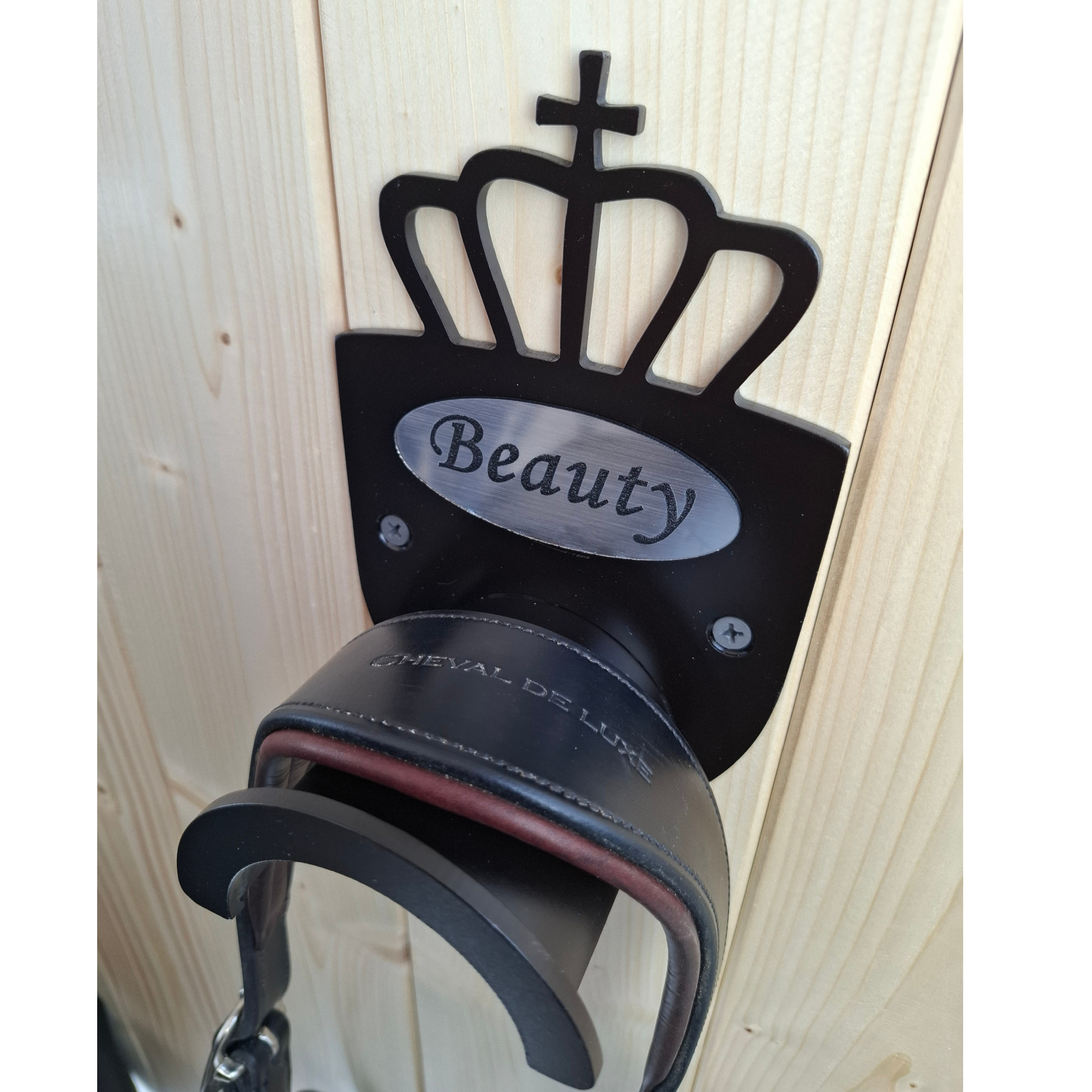 Der Trensenhalter „Royal“ mit Namensgravur verbindet maximale Funktionalität mit hochwertiger Verarbeitung. Der stabile Träger hält Ihr Zaumzeug sicher und schont dieses durch seinen runden Querschnitt – ideal auch für Longen, Seile oder andere leichte Stallutensilien.